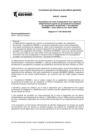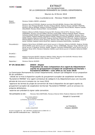 Proposition de mise à disposition d’un agent du Département auprès du groupement européen de coopération territoriale « Eurodistrict PAMINA » avec effet au 1er mars 2018