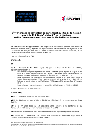 Proposition de mise en œuvre de deux projets de convention de partenariats à conclure respectivement avec la Communauté de communes du Ried de MARCKOLSHEIM et la Communauté d'Agglomération de HAGUENAU sur le territoire de l'ancienne Communauté de communes de BISCHWILLER pour la mise en œuvre du Programme d'intérêt général Rénov'Habitat 67