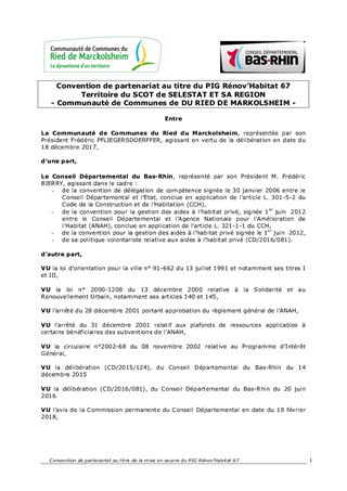 Le présent rapport a pour objet de proposer à la Commission Permanente de décider de la mise en place du partenariat pour la mise en œuvre du Programme d'Intérêt Général (PIG) Rénov'Habitat 67 sur le territoire de la Communauté de Communes du Ried de Marckolsheim et la Communauté d'Agglomération de Haguenau sur le territoire de l'ancienne Communauté de communes de Bischwiller. Il est également proposé d'approuver les termes des projets de convention à conclure, respectivement, pour la période 2016-2020 et 2018-2020 entre le Département, la Communauté de communes du Ried de Marckolsheim et entre le Département et la Communauté d'Agglomération de HAGUENAU.