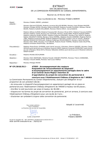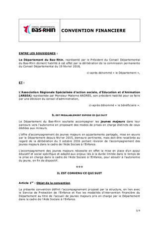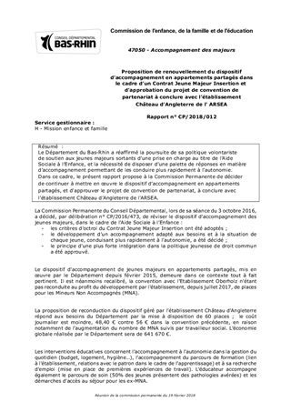 Le Département du Bas-Rhin a réaffirmé la poursuite de sa politique volontariste de soutien aux jeunes majeurs sortants d’une prise en charge au titre de l’Aide Sociale à l’Enfance, et la nécessité de disposer d’une palette de réponses en matière d’accompagnement permettant de les conduire plus rapidement à l’autonomie. Dans ce cadre, le présent rapport propose à la Commission Permanente de décider de continuer à mettre en œuvre le dispositif d’accompagnement en appartements partagés, et d'approuver le projet de convention de partenariat, à conclure avec l’établissement Château d’Angleterre de l'ARSEA.