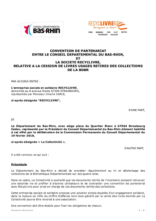 Proposition de convention de partenariat avec RECYCLIVRES pour la cession de documents usagés retirés des collections de la Bibliothèque départementale du Bas-Rhin