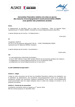 Depuis le 1er janvier 2009, le Département du Bas-Rhin est compétent pour mettre en œuvre les Mesures d'Accompagnement Social Personnalisé (MASP) en application de la loi 2007-308 du 5 mars 2007 relative à la protection juridique des majeurs. Les MASP peuvent être des MASP dites simples ou des MASP avec gestion de prestations sociales. Depuis le 1er novembre 2009, l’exercice des MASP avec gestion de prestations sociales a été délégué à l’Union Départementale des Associations Familiales (UDAF). Le présent rapport a pour objet de proposer à la Commission Permanente de décider du renouvellement de cette délégation à l’UDAF pour la période 2018-2021.