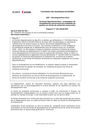 Le Conseil départemental du Bas-Rhin a décidé, par délibération n° CD/2016/158 du 8 décembre 2016 et CD/2017/004 du 20 mars 2017 de développer un partenariat renforcé avec les acteurs locaux au travers de contrats départementaux de développement territorial et humain. Ces contrats constituent le volet stratégique du partenariat engagé par le Département avec les acteurs locaux sur la période 2018 – 2021. Ils ont vocation à traduire l’ambition collective à l’échelle de chaque territoire d’action du Département et à définir les enjeux prioritaires d’aménagement et de développement co-construits avec les acteurs des territoires. Dans ce cadre, le Conseil départemental a également fixé par délibération n° CD/2017/004 les modalités de gestion du Fonds de développement et d’attractivité, du Fonds de solidarité communale, et du Fonds d’innovation territoriale sur lesquelles s’appuient les contrats départementaux. Dans le prolongement de ces délibérations, le présent rapport propose à l’Assemblée départementale de décider de compléter les modalités de gestion du Fonds de solidarité communale. Par ailleurs, il propose de donner délégation à la Commission Permanente pour attribuer les subventions au titre du Fonds de développement et d’attractivité, du Fonds d’innovation territoriale et du Fonds de solidarité communale.