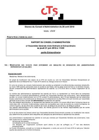 Le présent rapport a pour objet de proposer au Conseil Départemental de décider d'approuver le projet de modification des statuts de la Compagnie des Transports Strasbourgeois (CTS), dont le Département du Bas-Rhin est actionnaire. Ce projet porte sur la composition du Conseil d'Administration et en particulier sur les modalités de désignation des administrateurs représentant les salariés.