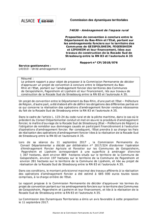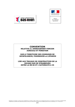 Le présent rapport a pour objet de proposer à la Commission Permanente de décider d'approuver un projet de convention à conclure entre le Département du Bas-Rhin et l'Etat, portant sur l'aménagement foncier des territoires des Communes de Geispolsheim, Fegersheim et Lipsheim et leur financement, liés aux travaux de construction de la Rocade Sud de Strasbourg entre la RN 83 et l'autoroute A 35.