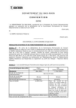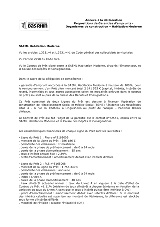 Le présent rapport a pour objet de proposer à la Commission Permanente de décider d’accorder une garantie d’emprunt pour un prêt souscrit par la SAEML Habitation Moderne pour l’opération de construction d’un Etablissement Social et Médico-Social (ESMS) à Lingolsheim.