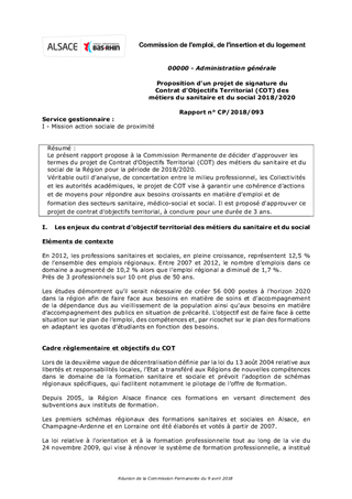 Le présent rapport propose à la Commission Permanente de décider d'approuver les termes du projet de Contrat d'Objectifs Territorial (COT) des métiers du sanitaire et du social de la Région pour la période de 2018/2020. Véritable outil d’analyse, de concertation entre le milieu professionnel, les Collectivités et les autorités académiques, le projet de COT vise à garantir une cohérence d’actions et de moyens pour répondre aux besoins croissants en matière d’emploi et de formation des secteurs sanitaire, médico-social et social. Il est proposé d'approuver ce projet de contrat d'objectifs territorial, à conclure pour une durée de 3 ans.