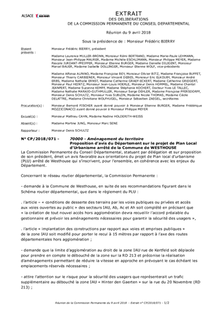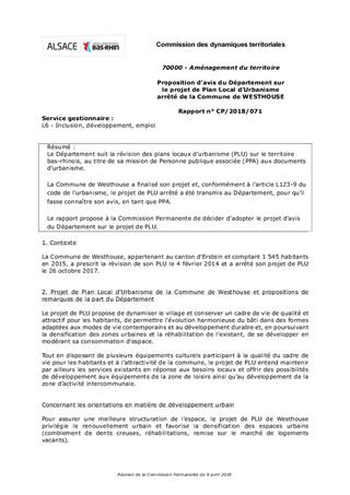 Le Département suit la révision des plans locaux d’urbanisme (PLU) sur le territoire bas-rhinois, au titre de sa mission de Personne publique associée (PPA) aux documents d’urbanisme. La Commune de Westhouse a finalisé son projet et, conformément à l'article L123-9 du code de l’urbanisme, le projet de PLU arrêté a été transmis au Département, pour qu’il fasse connaître son avis, en tant que PPA. Le rapport propose à la Commission Permanente de décider d’adopter le projet d’avis du Département sur le projet de PLU.