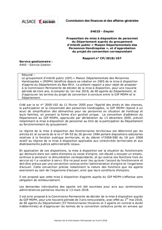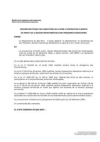 Le groupement d’intérêt public (GIP) « Maison Départementale des Personnes Handicapées » (MDPH) bénéficie depuis sa création en 2005 de la mise à disposition d’agents du Département du Bas-Rhin. Le présent rapport a pour objet de proposer à la Commission Permanente de décider de la mise à disposition, pour une nouvelle période de trois ans, à compter du 1er mai 2018, de 60 agents du Département, et d’approuver les termes du projet de convention à conclure entre le GIP MDPH et le Département.