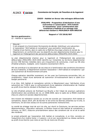 Il est proposé à la Commission Permanente de décider d'attribuer une subvention à l'association "AVA habitat et nomadisme" pour permettre l'amélioration de l'habitat d'une famille, dans le cadre de la Maîtrise d'ouvrage urbaine et sociale du Département, en conformité avec les objectifs du plan départemental d'action pour le logement et l'hébergement des personnes défavorisées (PDALHPD) 2015-2020.