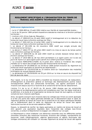 Le rapport a pour objet de proposer à la Commission Permanente de décider de l’approbation des termes d’un nouveau règlement spécifique du temps de travail applicable aux agents techniques des collèges à partir de la rentrée scolaire de septembre 2018 et de la mise à jour du règlement intérieur du compte épargne temps pour les agents des collèges. Par ailleurs, il est proposé à la Commission Permanente de prendre acte de la révision du droit au report des congés annuels après un congé maladie, pour l’ensemble des agents de la collectivité.