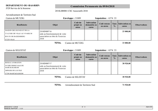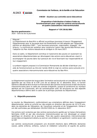 Le Département du Bas-Rhin a affirmé sa politique jeunesse à travers l'Engagement Départemental pour la Jeunesse dont les fondements ont été adoptés par l'Assemblée plénière en décembre 2007 : "une Jeunesse autonome, responsable, engagée". Par ailleurs, il a confirmé son ambition pour construire l’avenir des jeunes Bas-Rhinois avec l’adoption du Plan Actions éducatives et collèges le 20 mars 2017. Dans ce cadre, le Département contribue à l’autonomie des jeunes en soutenant les associations départementales qui développent des actions socio-éducatives visant à accompagner les jeunes dans leur parcours de vie et favorisant leur responsabilité et leur engagement. Le présent rapport propose à la Commission Permanente de décider d'attribuer une aide de fonctionnement au titre de l'année 2018 à vingt-six centres socio-culturels et à quatre associations intercommunales socio-éducatives du Bas-Rhin.