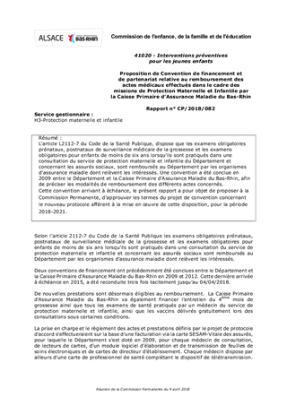 L’article L2112-7 du Code de la Santé Publique, dispose que les examens obligatoires prénataux, postnataux de surveillance médicale de la grossesse et les examens obligatoires pour enfants de moins de six ans lorsqu’ils sont pratiqués dans une consultation du service de protection maternelle et infantile du Département et concernant les assurés sociaux, sont remboursés au Département par les organismes d’assurance maladie dont relèvent les intéressés. Une convention a été conclue en 2009 entre le Département et la Caisse Primaire d’Assurance Maladie du Bas-Rhin, afin de préciser les modalités de remboursement des différents actes concernés. Cette convention arrivant à échéance, le présent rapport a pour objet de proposer à la Commission Permanente, d'approuver les termes du projet de convention concernant le nouveau protocole afférent à la mise en œuvre de cette disposition, pour la période 2018-2021.