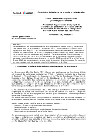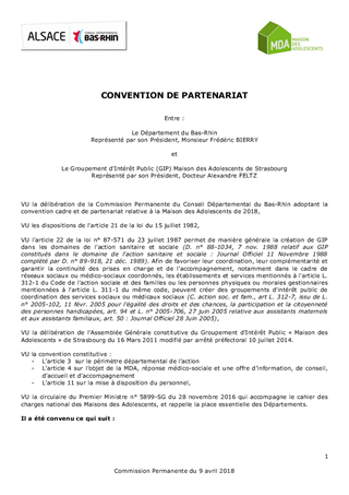 Le Département est membre fondateur du Groupement d'Intérêt Public (GIP) Maison des Adolescents (MDA) depuis sa création en 2011. Les termes de la convention de partenariat du 8 août 2013 qui lie le Département du Bas-Rhin et la MDA doivent être révisés, les modalités de participation du Département évoluant au regard du transfert de la compétence de prévention spécialisée à l’Eurométropole de Strasbourg pour ce qui concerne son territoire, dont le financement via la dotation annuelle de transfert est assuré par le Département depuis le 1er janvier 2017, consécutif à la loi NOTRe du 7 août 2015. Le présent rapport a pour objet de proposer à la Commission Permanente un nouveau cadre du partenariat entre le Département et la MDA.