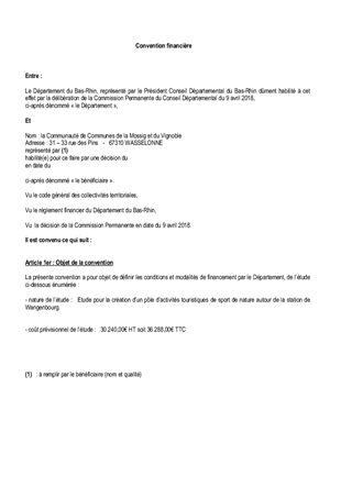 Le Conseil départemental du Bas-Rhin a décidé, par délibération n° CD/2016/158 du 8 décembre 2016 et CD/2017/004 du 20 mars 2017 de développer un partenariat renforcé avec les acteurs locaux au travers des contrats départementaux de développement territorial et humain. Dans le cadre du Fonds d'innovation territoriale, le présent rapport propose à la Commission Permanente de décider de cofinancer une étude en vue de la création d’un Pôle d’activités touristiques de Sports de Nature à Wangenbourg sur le territoire de la Communauté de Communes de la Mossig et du Vignoble. Cette étude a pour objet de produire un diagnostic territorial approfondi, de proposer une stratégie opérationnelle et de formaliser un programme d'actions opérationnel. Il est également proposé à la Commission Permanente de décider d'approuver les termes du projet de convention financière à conclure pour ce projet.