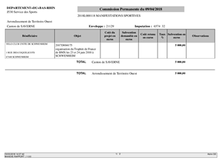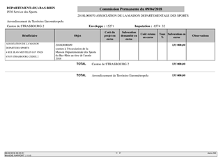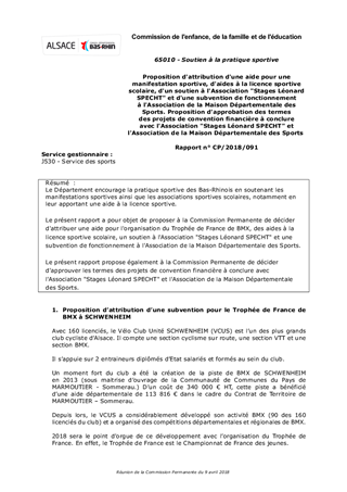 Le Département encourage la pratique sportive des Bas-Rhinois en soutenant les manifestations sportives ainsi que les associations sportives scolaires, notamment en leur apportant une aide à la licence sportive. Le présent rapport a pour objet de proposer à la Commission Permanente de décider d'attribuer une aide pour l'organisation du Trophée de France de BMX, des aides à la licence sportive scolaire, un soutien à l'Association "Stages Léonard SPECHT" et une subvention de fonctionnement à l'Association de la Maison Départementale des Sports. Le présent rapport propose également à la Commission Permanente de décider d'approuver les termes des projets de convention financière à conclure avec l'Association "Stages Léonard SPECHT" et l'Association de la Maison Départementale des Sports.