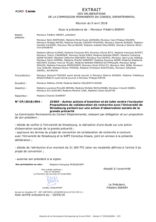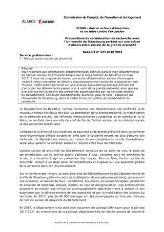 Pour répondre aux orientations départementales définies dans le Plan départemental de l'Action Sociale de Proximité adopté par le Département du Bas-Rhin en mars 2017, il vous est proposé de mener une action d’observation sociale d’envergure visant à mieux connaitre les besoins d’accompagnement social de la population bas-rhinoise. Cette action porterait sur une analyse socio-démographique permettant d'anticiper les déterminants présents et à venir de la grande précarité, ainsi que sur une analyse de trajectoire des personnes accompagnées par les services sociaux du Département. L'Exécutif départemental souhaite, pour ce faire, s’appuyer sur l'Université de Strasbourg, dans le cadre d'une convention de collaboration de recherche.
