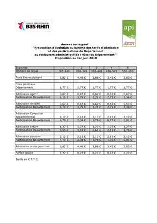 Le présent rapport a pour objet de proposer à la Commission Permanente de décider de l'évolution du barème des participations allouées aux usagers du Département pour les repas pris au restaurant administratif de l'Hôtel du Département et pour les repas payés avec les titres restaurants.