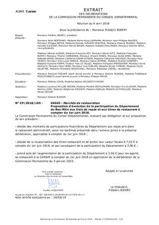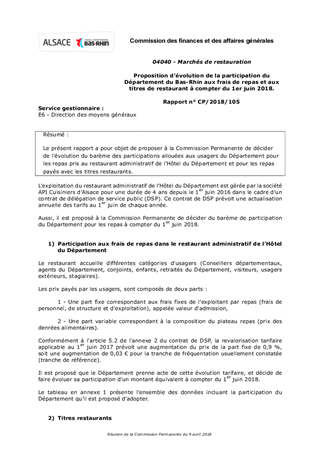 Proposition d'évolution de la participation du Département du Bas-Rhin aux frais de repas et aux titres de restaurant à compter du 1er juin 2018.