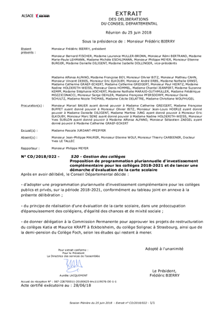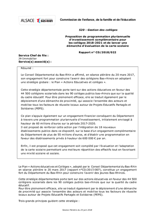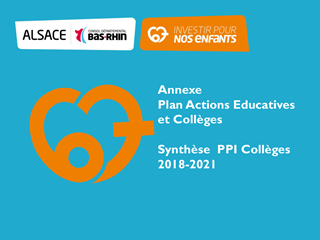 Le Conseil Départemental du Bas-Rhin a affirmé, en séance plénière du 20 mars 2017, son engagement fort pour construire l’avenir des collégiens Bas-rhinois en adoptant une stratégie globale : le Plan « Actions Educatives et collèges ». Cette stratégie départementale porte tant sur des actions éducatives en faveur des 44 500 collégiens scolarisés dans les 90 collèges publics bas-rhinois que sur la qualité du cadre éducatif. Pour être pleinement efficace, elle se traduit également par le déploiement d’une démarche de proximité, qui associe l’ensemble des acteurs et mobilise tous les facteurs de réussite locaux autour de Projets Educatifs Partagés et Solidaires (PEPS). Ce plan s’appuie également sur un engagement financier conséquent du Département à travers une programmation pluriannuelle d’investissement, initialement envisagé à hauteur de 60 millions d’euros sur la période 2017-2020. Il est proposé de renforcer cette action par l’intégration de 18 nouveaux établissements publics dans ce dispositif, sur la base d’un engagement complémentaire du Département de plus de 55 millions d'euros, et d'établir une programmation en faveur des établissements privés à hauteur de 600 000 € par an. Enfin, il est proposé que cet engagement soit complété par l’évaluation et l’adaptation de la carte scolaire permettant une meilleure répartition des effectifs tout en favorisant une mixité scolaire et sociale.