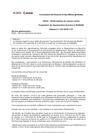 Le présent rapport a pour objet de proposer à la Commission Permanente de décider du transfert d'un délaissé de la RD 422 au profit de la Commune de WANGEN.