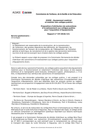 Le Département est responsable de la construction, de la reconstruction, de l'extension, des grosses réparations des bâtiments, de l'équipement, du fonctionnement, de l’accueil, de la restauration, de l’hébergement, de l’entretien général et technique, du recrutement et de la gestion des personnels techniciens, ouvriers et de service exerçant leurs missions dans les collèges publics. Le Présent rapport a pour objet de proposer à la Commission Permanente de décider d'attribuer des subventions d'investissement aux collèges publics pour l'acquisition d'équipements divers.