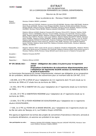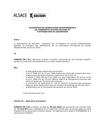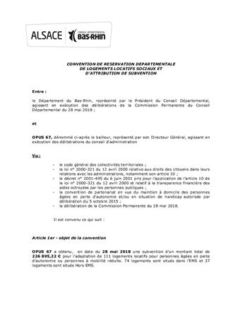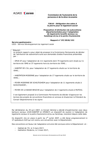 Le présent rapport a pour objet de proposer à la Commission Permanente de décider de l’attribution de subventions suite aux demandes d’aides financières présentées par : - OPUS 67 pour l’adaptation de 111 logements dont 74 logements sont situés sur le territoire de l’EMS et 37 logements hors du territoire de l'EMS ; - HABITAT DE L’ILL pour l’adaptation de 17 logements situés sur le territoire de l’EMS ; - HABITATION MODERNE pour l’adaptation de 17 logements situés sur le territoire de l’EMS ; - FOYER MODERNE DE SCHILTIGHEIM pour l’adaptation de 11 logements situés à SCHILTIGHEIM ; - FOYER DE LA BASSE BRUCHE pour l'adaptation de 2 logements situés à MUTZIG. Il est également proposé à la Commission Permanente de décider d'approuver les termes des projets de conventions financières en annexe et d’autoriser le Président du Conseil Départemental à les signer.