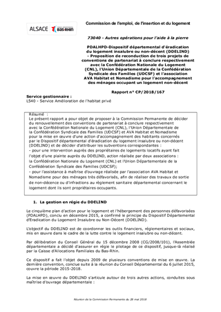 Le présent rapport a pour objet de proposer à la Commission Permanente de décider du renouvellement des conventions de partenariat à conclure respectivement avec la Confédération Nationale du Logement (CNL), l'Union Départementale de la Confédération Syndicale des Familles (UDCSF) et AVA Habitat et Nomadisme pour la mise en œuvre d'une action d'accompagnement des habitants concernés par le Dispositif départemental d'éradication du logement insalubre ou non-décent (DDELIND) et de décider d'attribuer les subventions correspondantes : - pour une intervention auprès des propriétaires de logements locatifs ayant fait l'objet d'une plainte auprès du DDELIND, action réalisée par deux associations : la Confédération Nationale du Logement (CNL) et l'Union Départementale de la Confédération Syndicale des Familles (UDCSF); - pour l'assistance à maîtrise d'ouvrage réalisée par l'association AVA Habitat et Nomadisme pour des ménages très défavorisés, afin de réaliser des travaux de sortie de non-décence ou d'infractions au règlement sanitaire départemental concernant le logement dont ils sont propriétaires occupants.