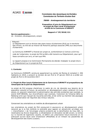 Le Département suit la révision des plans locaux d’urbanisme (PLU) sur le territoire bas-rhinois, au titre de sa mission de Personne publique associée (PPA) aux documents d’urbanisme. La Commune d’URMATT a finalisé son projet et, conformément à l'article L123-9 du code de l’urbanisme, le projet de PLU arrêté a été transmis au Département, pour qu’il fasse connaître son avis, en tant que PPA. Le rapport propose à la Commission Permanente de décider d’adopter le projet d’avis du Département sur le projet de PLU.