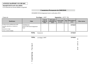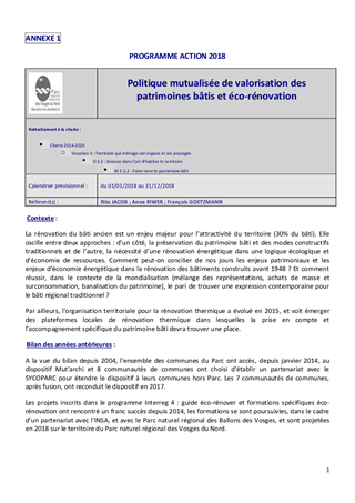 Le Département est membre du Syndicat de coopération pour le Parc naturel régional des Vosges du Nord (SYCOPARC) et signataire de la charte du Parc naturel régional des Vosges du Nord (PNRVN). Le présent rapport a pour objet de proposer à la Commission Permanente de décider : - d'attribuer une subvention de 95 960 € pour l'année 2018 au SYCOPARC pour la mise en œuvre du programme d’actions 2018, - d’approuver les termes d’un projet de convention financière à conclure entre le Département du Bas-Rhin et le SYCOPARC, pour préciser l’engagement du Département dans le programme d’actions 2018 du SYCOPARC : mise en œuvre des actions relatives à la valorisation du patrimoine bâti, redynamisation de l’habitat dans les centres bourgs, sensibilisation des collégiens, médiation culturelle en lien avec le patrimoine et mise en place d’une exposition collective des 10 musées de la Conservation du SYCOPARC.