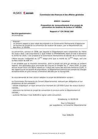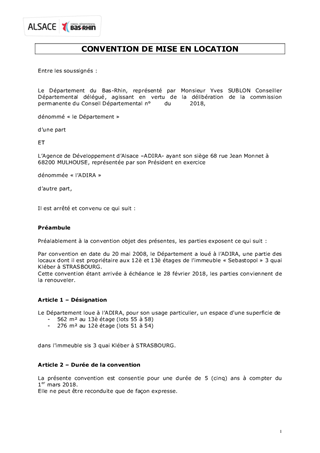 Le présent rapport a pour objet de proposer à la Commission Permanente d'approuver les termes du projet de la convention de location de locaux, par le Département du Bas-Rhin, à l'ADIRA.