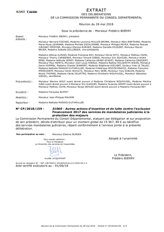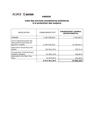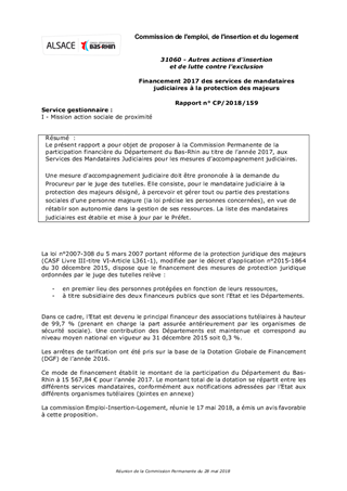 Le présent rapport a pour objet de proposer à la Commission Permanente de la participation financière du Département du Bas-Rhin au titre de l’année 2017, aux Services des Mandataires Judiciaires pour les mesures d’accompagnement judiciaires. Une mesure d'accompagnement judiciaire doit être prononcée à la demande du Procureur par le juge des tutelles. Elle consiste, pour le mandataire judiciaire à la protection des majeurs désigné, à percevoir et gérer tout ou partie des prestations sociales d'une personne majeure (la loi précise les personnes concernées), en vue de rétablir son autonomie dans la gestion de ses ressources. La liste des mandataires judiciaires est établie et mise à jour par le Préfet.