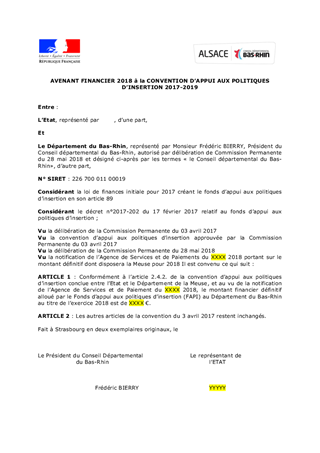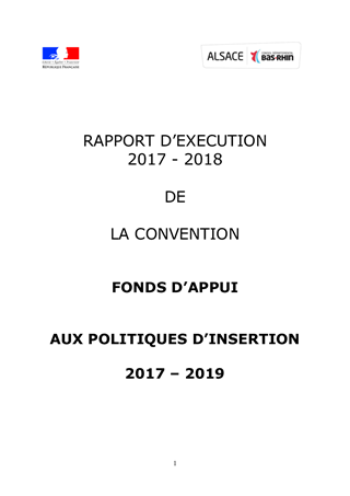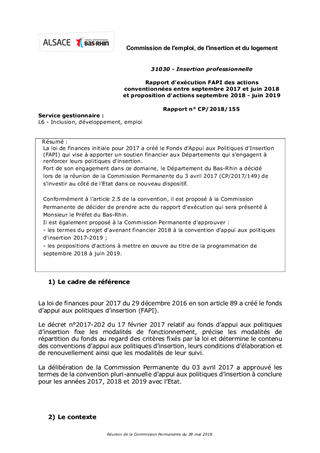 La loi de finances initiale pour 2017 a créé le Fonds d'Appui aux Politiques d'Insertion (FAPI) qui vise à apporter un soutien financier aux Départements qui s'engagent à renforcer leurs politiques d'insertion. Fort de son engagement dans ce domaine, le Département du Bas-Rhin a décidé lors de la réunion de la Commission Permanente du 3 avril 2017 (CP/2017/149) de s'investir au côté de l'Etat dans ce nouveau dispositif. Conformément à l’article 2.5 de la convention, il est proposé à la Commission Permanente de décider de prendre acte du rapport d’exécution qui sera présenté à Monsieur le Préfet du Bas-Rhin. Il est également proposé à la Commission Permanente d'approuver : - les termes du projet d'avenant financier 2018 à la convention d'appui aux politiques d'insertion 2017-2019 ; - les propositions d'actions à mettre en œuvre au titre de la programmation de septembre 2018 à juin 2019.