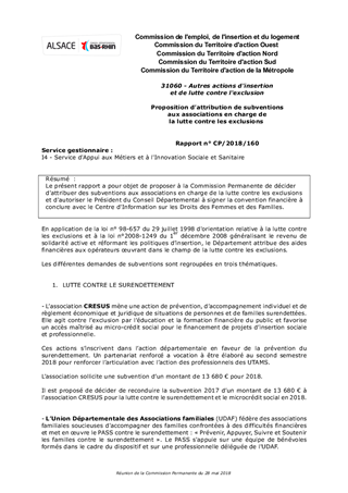 Le présent rapport a pour objet de proposer à la Commission Permanente de décider d'attribuer des subventions aux associations en charge de la lutte contre les exclusions et d'autoriser le Président du Conseil Départemental à signer la convention financière à conclure avec le Centre d'Information sur les Droits des Femmes et des Familles.