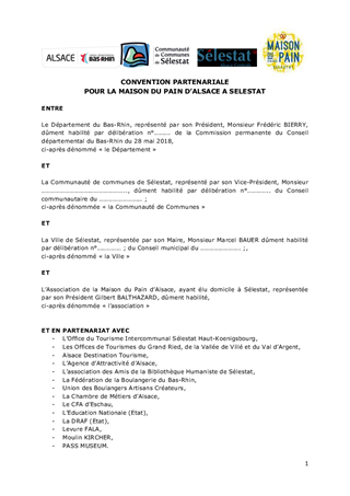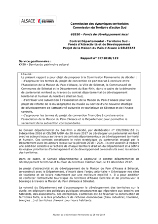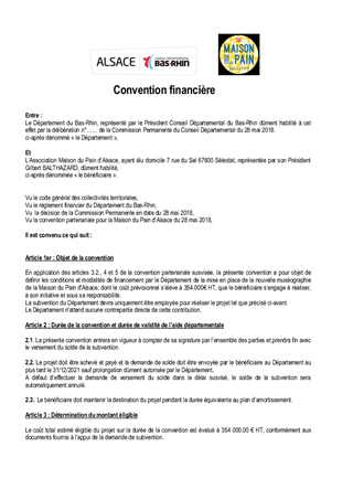 Le présent rapport a pour objet de proposer à la Commission Permanente de décider : - d’approuver les termes du projet de convention de partenariat à conclure entre l’Association de la Maison du Pain d’Alsace, la Ville de Sélestat, la Communauté de Communes de Sélestat et le Département du Bas-Rhin, dans le cadre de la démarche de partenariat renforcé au travers du contrat départemental de développement territorial et humain du territoire d’action Sud, - d'attribuer une subvention à l'association de la Maison du Pain d’Alsace pour son projet de refonte de la muséographie du musée au service d'une nouvelle stratégie de développement de l'attractivité culturelle et touristique de Sélestat et de l'Alsace centrale, - d'approuver les termes du projet de convention financière à conclure entre l'association de la Maison du Pain d’Alsace et le Département pour permettre le versement de la subvention correspondante.