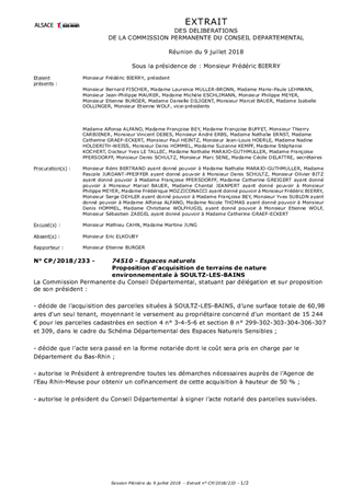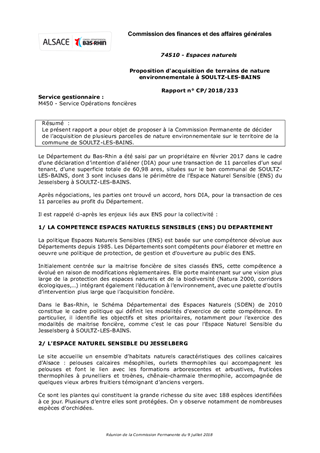 Le présent rapport a pour objet de proposer à la Commission Permanente de décider de l'acquisition de plusieurs parcelles de nature environnementale sur le territoire de la commune de SOULTZ-LES-BAINS.