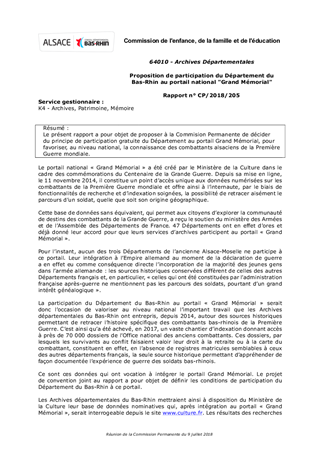 Le présent rapport a pour objet de proposer à la Commision Permanente de décider du principe de participation gratuite du Département au portail Grand Mémorial, pour favoriser, au niveau national, la connaissance des combattants alsaciens de la Première Guerre mondiale.