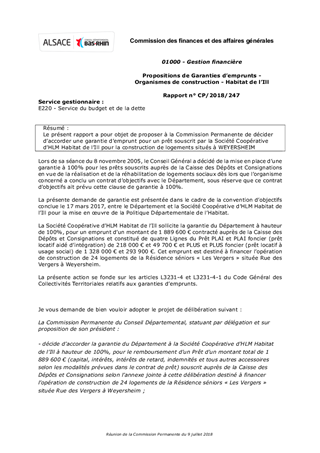Le présent rapport a pour objet de proposer à la Commission Permanente de décider d’accorder une garantie d’emprunt pour un prêt souscrit par la Société Coopérative d’HLM Habitat de l’Ill pour la construction de logements situés à WEYERSHEIM