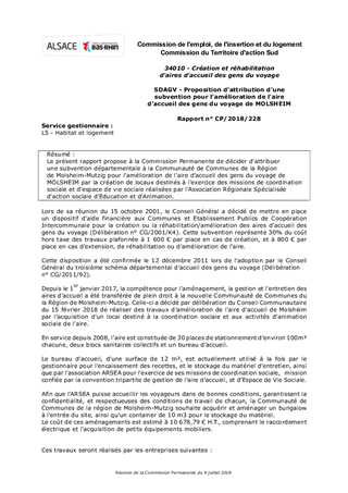 Le présent rapport propose à la Commission Permanente de décider d’attribuer une subvention départementale à la Communauté de Communes de la Région de Molsheim-Mutzig pour l’amélioration de l’aire d’accueil des gens du voyage de MOLSHEIM par la création de locaux destinés à l’exercice des missions de coordination sociale et d’espace de vie sociale réalisées par l’Association Régionale Spécialisée d'action sociale d'Education et d'Animation.