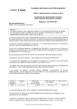 Le présent rapport a pour objet de proposer à la Commission Permanente de décider de l'acquisition de deux parcelles de terrain situées à LALAYE dans le cadre d'une régularisation foncière dans l'emprise de la RD 97.
