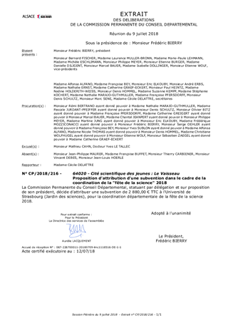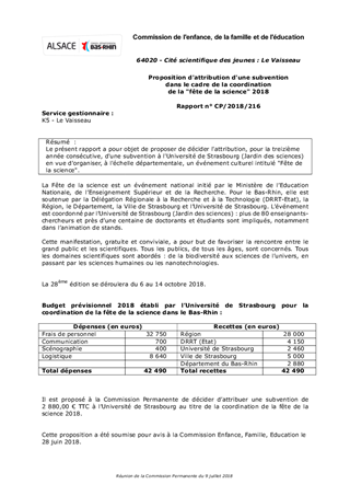 Le présent rapport a pour objet de proposer de décider l'attribution, pour la treizième année consécutive, d'une subvention à l'Université de Strasbourg (Jardin des sciences) en vue d'organiser, à l'échelle départementale, un événement culturel intitulé "Fête de la science".