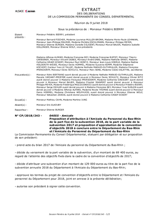 Le présent rapport a pour objet de proposer à la Commission Permanente de proposer de prendre acte du bilan 2017 de l'Amicale, de décider du versement de la part variable et d'attribuer la part fixe de la subvention annuelle 2018 à l’Amicale du personnel du Département du Bas-Rhin, en application de la convention cadre 2015/2018 approuvée par délibération N°2014-67 du Conseil Général le 8 décembre 2014. Il propose également à la Commission Permanente de décider d’approuver les termes du projet de convention d’objectifs 2018 à conclure entre le Département du Bas-Rhin et l’Amicale du Personnel du Département du Bas-Rhin.