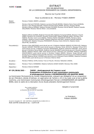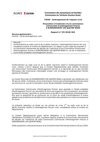 Conformément au code rural et de la pêche maritime, l’aménagement foncier est une compétence pleine et entière du Département. Ce rapport a pour objet de proposer à la Commission Permanente de décider de l’institution d'une Commission Communale d’Aménagement Foncier à WINGERSHEIM LES QUATRE BANS en vue de la réalisation d’une étude préalable d’aménagement foncier.