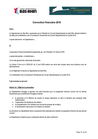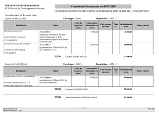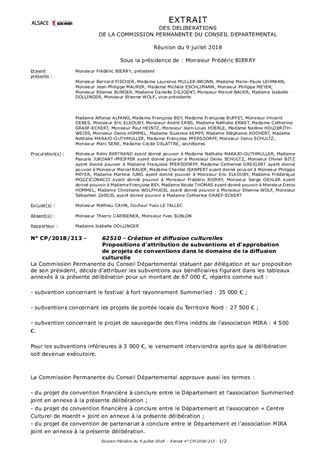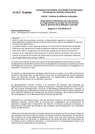 Dans le cadre de sa politique culturelle, le Département apporte un soutien au développement artistique de ses territoires ainsi qu'aux actions de médiation culturelle en faveur des Bas-Rhinois. Le présent rapport a pour objet de proposer à la Commission Permanente de décider d'attribuer des subventions à quatre projets de diffusion culturelle pour un montant total de 67 000 €, d’approuver les termes des projets de convention financière à conclure avec l’association Summerlied et le Centre Culturel de Hoerdt, ainsi que les termes du projet de convention de partenariat à conclure avec l’association Mémoire des Images Réanimées d’Alsace (MIRA).