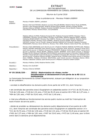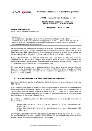 Le présent rapport propose à la Commission Permanente de décider de la désaffectation et du déclassement d’une partie de la RD 111 en vue d’un échange de terrains avec les propriétaires riverains pour la construction du nouveau tracé de la voirie départementale à DUPPIGHEIM.