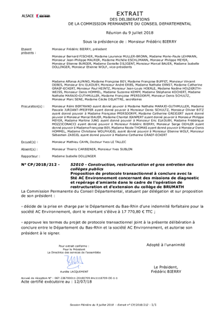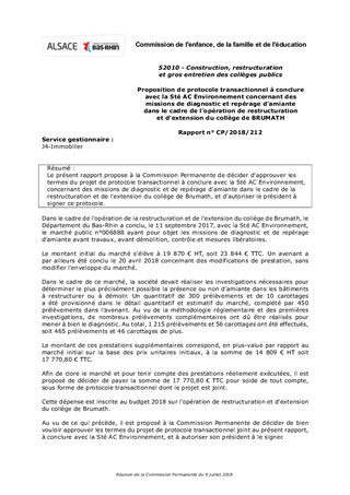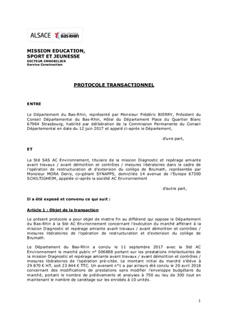 Le présent rapport propose à la Commission Permanente de décider d'approuver les termes du projet de protocole transactionnel à conclure avec la Sté AC Environnement, concernant des missions de diagnostic et de repérage d'amiante dans le cadre de la restructuration et de l'extension du collège de Brumath, et d'autoriser le président à signer ce protocole.
