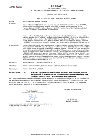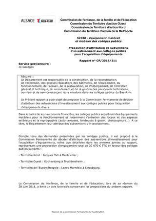 Le Département est responsable de la construction, de la reconstruction, de l'extension, des grosses réparations des bâtiments, de l'équipement, du fonctionnement, de l’accueil, de la restauration, de l’hébergement, de l’entretien général et technique, du recrutement et de la gestion des personnels techniciens, ouvriers et de service exerçant leurs missions dans les collèges publics du Bas-Rhin. Le Présent rapport a pour objet de proposer à la Commission Permanente de décider d'attribuer des subventions d'investissement aux collèges publics pour l'acquisition d'équipements divers.