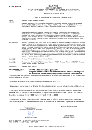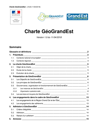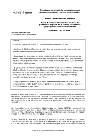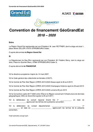 Le présent rapport propose à la Commission Permanente de décider : - d'adhérer à GéoGrandEst, dans le cadre d'un partenariat adossé à une charte qui pourrait être signée par le Département ; - d'approuver les termes du projet de charte GéoGrandEst qui vise à coordonner les actions complémentaires et partenariales de la Région, de l’Etat, des Collectivités et d’autres acteurs publics comme les parcs naturels ou les syndicats de SCOT en matière d’information géographique ; - d'approuver les termes d’un projet de convention de co-financement du partenariat GéoGrandEst. Le financement du Département permettrait de développer des services complémentaires en matière d’animation autour de l’information géographique, de co-production de données, en plus des services de base déjà pris en charge financièrement par la Région et par l’Etat. La Région propose la mise en place de ce partenariat conformément au rôle que lui assigne l’article L.4211-1, 13° du Code général des collectivités territoriales issu de la loi n°2015-991 du 7 août 2015.