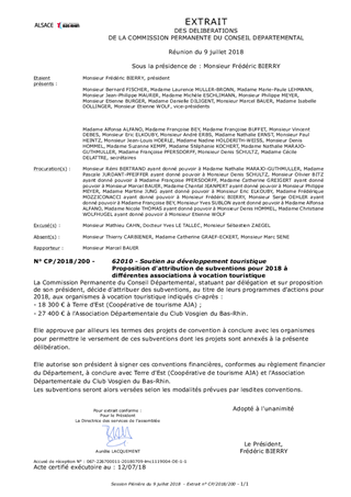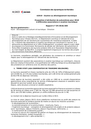 Dans le cadre de la Stratégie Interdépartementale d'Innovation et de Développement Touristique pour l'Alsace 2017/21, le Département contribue à l'attractivité et au développement de son territoire par la promotion de l'excellence alsacienne. A cette fin, il soutient des associations à vocation touristique qui contribuent à l'accueil, à la découverte du département et à l'offre d'hébergement. Le présent rapport a pour objet de proposer à la Commission Permanente de décider de l'attribution de subventions à Terre d'Est (Coopérative de tourisme solidaire AJA) et à l'Association Départementale du Club Vosgien du Bas-Rhin. Il propose également d'approuver les termes des projets des conventions financières afférentes.