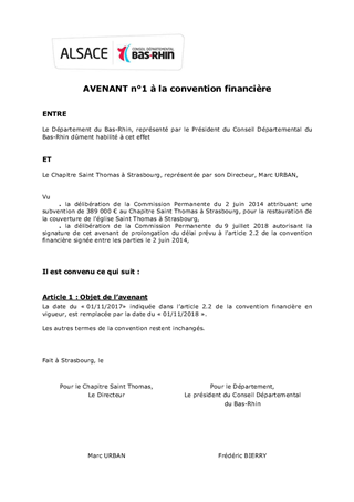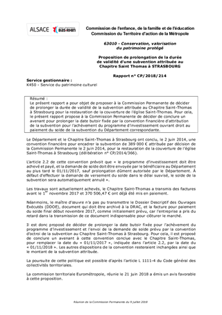 Le présent rapport a pour objet de proposer à la Commission Permanente de décider de prolonger la durée de validité de la subvention attribuée au Chapitre Saint-Thomas à Strasbourg pour la restauration de la couverture de l'église Saint-Thomas. Pour cela, le présent rapport propose à la Commission Permanente de décider de conclure un avenant pour prolonger la date butoir fixée par la convention financière d'attribution de la subvention pour l'achèvement du programme d'investissement ouvrant droit au paiement du solde de la subvention du Département correspondante.